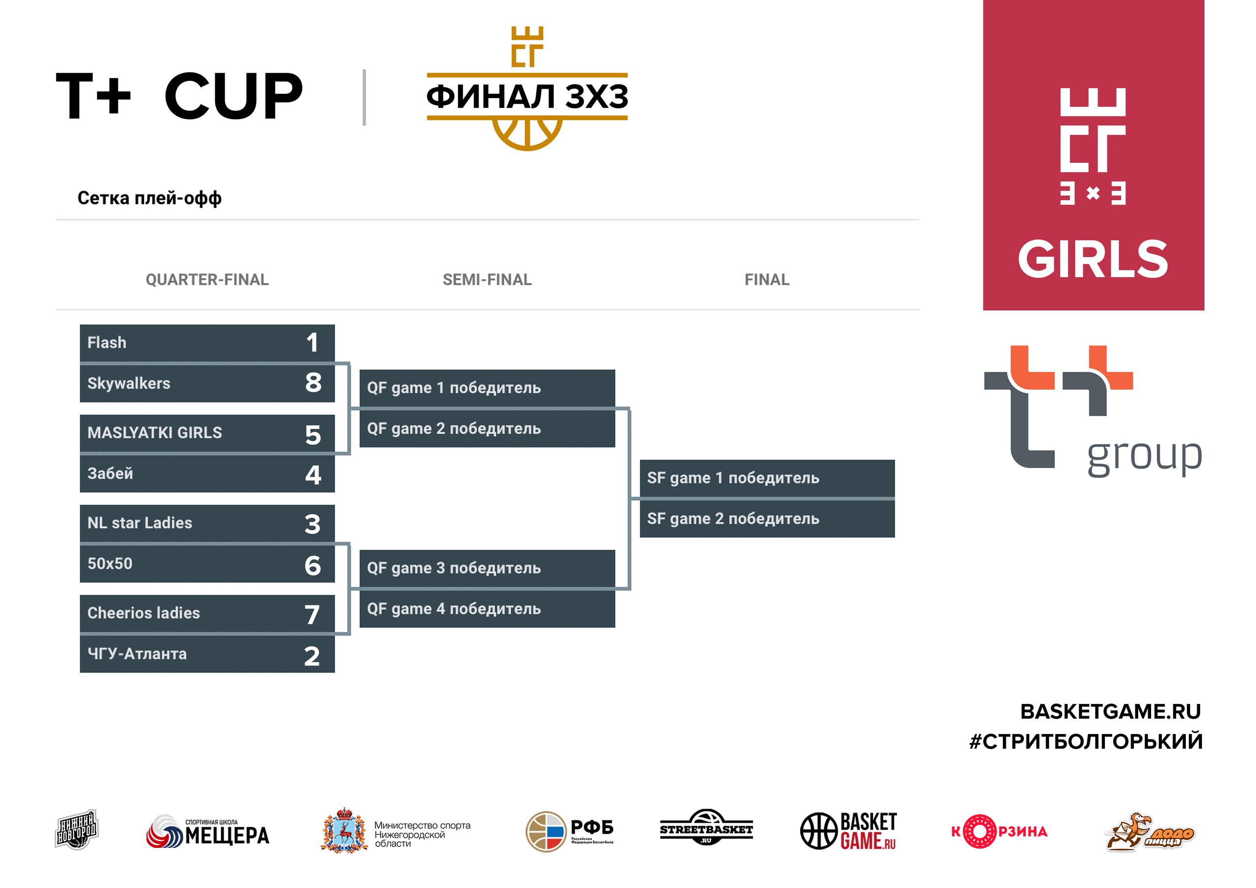 Три тура смертельных уличных баталий позади! В субботу мы уже узнаем победителя лиги «Стритбол Горький 3х3», а вот пары плей – офф «Т+ CUP 2017» известны уже сейчас. Кто чего стоит в большом финале? Где фавориты, а где аутсайдеры? Разбираем под микроскопом предстоящие матчи. Вы готовы? Тогда погнали! (осторожно, лонгрид)